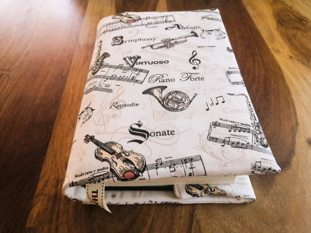Šitý obal na knihu s motivem hudebních nástrojů. Materiál 100% bavlna, uvnitř měkký termolín 180g. Obal je prošitý a může být použit oboustranně. Samozřejmostí je všitá záložka. Obal je rostoucí, tedy může být použitý na více rozměrů knih. Výška šitého obalu je 27 cm šířka 16 cm. I zde na vás čeká 1 kousek :)